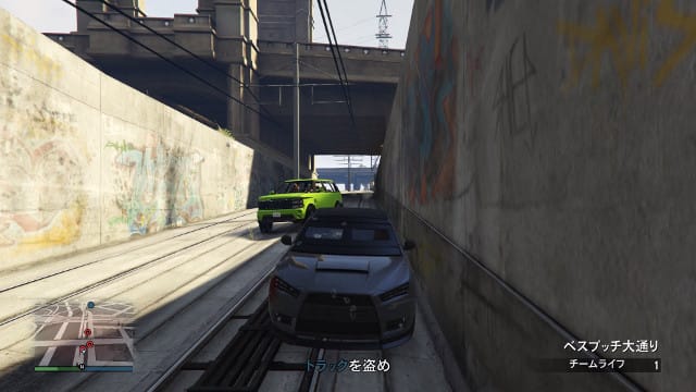 よって、逃走中は車体が実際に曲がらない程度に小刻みに高速で左スティックを左右に揺すってやると、追手NPCはこちらのスティック操作に反応して左右にジグザグ走行をして速度を落としたり他のNPC車と衝突したりするので結果として追いつかれにくくなる。