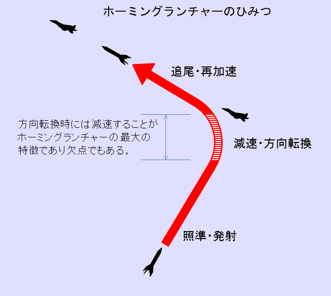 一方、ホーミングランチャーは誘導性能自体は実はあまり高くはない。その代わり、ホーミングランチャーは目標を大きく外れて通り過ぎそうになる(オーバーシュートしそうになる)と、急ブレーキをかけて減速しつつ急旋回し、標的を捉えると再び加速するのだ。(下図参照)