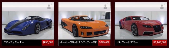 中でもアダーやエンティティーXF、チーターといった、オンライン開始当初からあった古参のスーパーカーは、当時はジョブの報酬額が現在よりもかなり低かったこともあり、プレイヤーたちにとって高嶺の花とされていた。とくにアダーの100万ドルという価格は当時のあらゆるアイテムの中ではダントツの最高額であり、アダーの購入は多くのプレイヤーの目標の1つとなっていた。ジョブの報酬額が全体的に低かった当時は、$100万は途方もない大金だったのだ。
