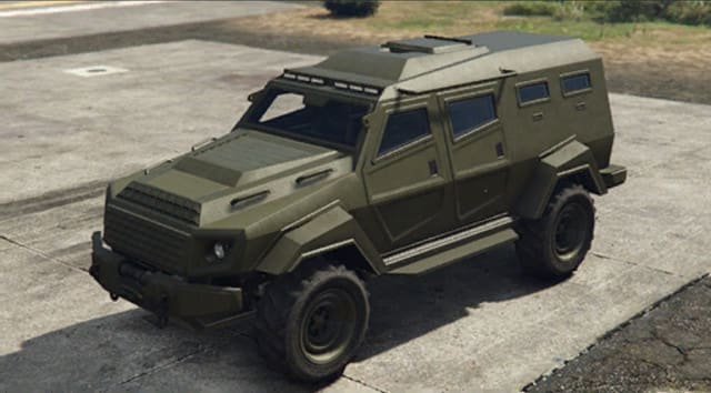 ミッションでは最もポピュラーと思われる防弾車。耐爆性能こそ無いものの、「敵NPCの銃撃を“ほぼ”車内に通さない」という特徴のため、基本的には爆発物を使用しないNPCとミッションで戦うには最も向いている装甲車だと思われる。ミッションではこの車に乗ったままドライブバイで撃ちまくっていればだいたい安全に敵を掃討できるだろう。
