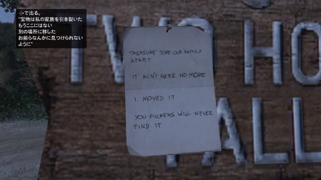 今回のトレジャーハント、ミッションとしては単純で、とくにストーリー性も無いものの、置き手紙や放置された死体などの思わせぶりな演出などはRDRシリーズを思い起こさせるものとなっている。